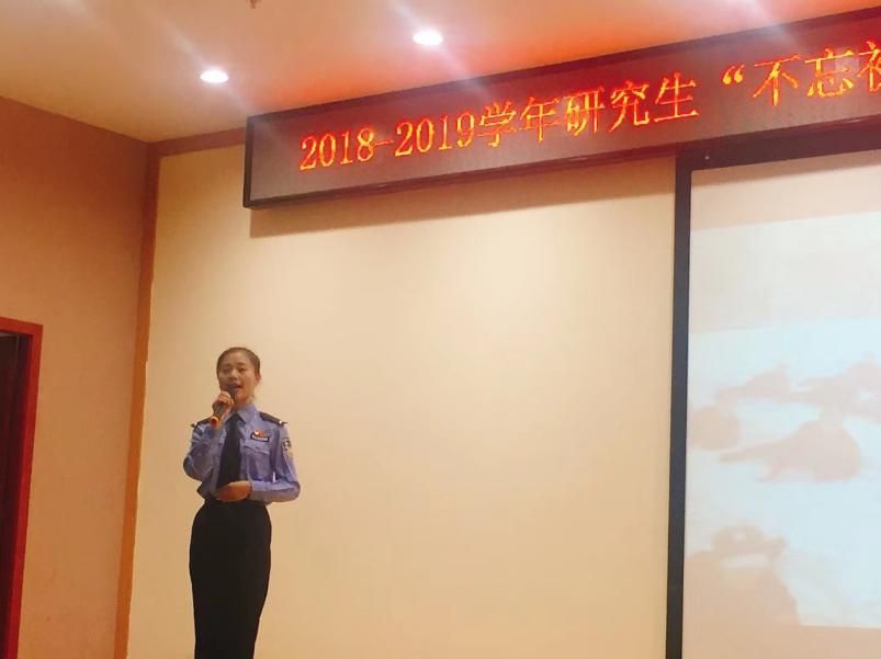 高晨珍同学以“不忘初心,实现青春梦想”为题,阐述了她为实现警察梦想而付出的努力,号召大家不忘初心,以梦为马,努力提升学术研究能力,遵守学术诚信,实现青春梦想。她用铿锵有力的语言向大家讲述了自己在追梦路上的心路历程,或在大雨中奔跑,或在大雪里匍匐,或在训练场上挥洒汗水,或独自流下艰辛的泪水,这些经历都是她的别样青春。高晨珍声情并茂的演讲诠释了自己的警营青春,用真情打动了评委,博得现场观众热烈掌声,最终以94.6分荣获一等奖。