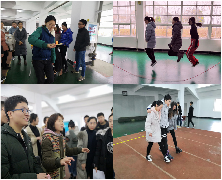 此次活动均为团体赛,设有三人四足、集体跳绳、你比我猜和夹乒乓球4个比赛项目。比赛活动一开始,现场就沸腾起来,在三人四足项目中,各个小组齐心协力、相互扶持,迈着统一地步伐共同前进,尽力在最短的时间内到达终点;在集体跳绳项目中,选手时不时将跳绳就挂到了腿上,大家忍不住发出笑声,各组在失误和欢笑中完成了比赛项目;而在你比我猜项目中,更是乐趣不断,各组的表演人员“八仙过海,各显神通”,比划的同学挤眉弄眼,猜谜的同学则是 一脸茫然地看着队友手舞足蹈;夹乒乓球项目中可是花样百出,每位同学在夹起乒乓球后都奋力奔跑,不时有乒乓球从筷子中滑落出来,大家又去手忙脚乱地赶紧救球,惹得观众和选手哈哈大笑。同学们在快乐的运动中,相互鼓劲、、互帮互助、协同作战,加油声、鼓劲声和呐喊声一浪高过一浪,脸上都挂满了开心的笑容。