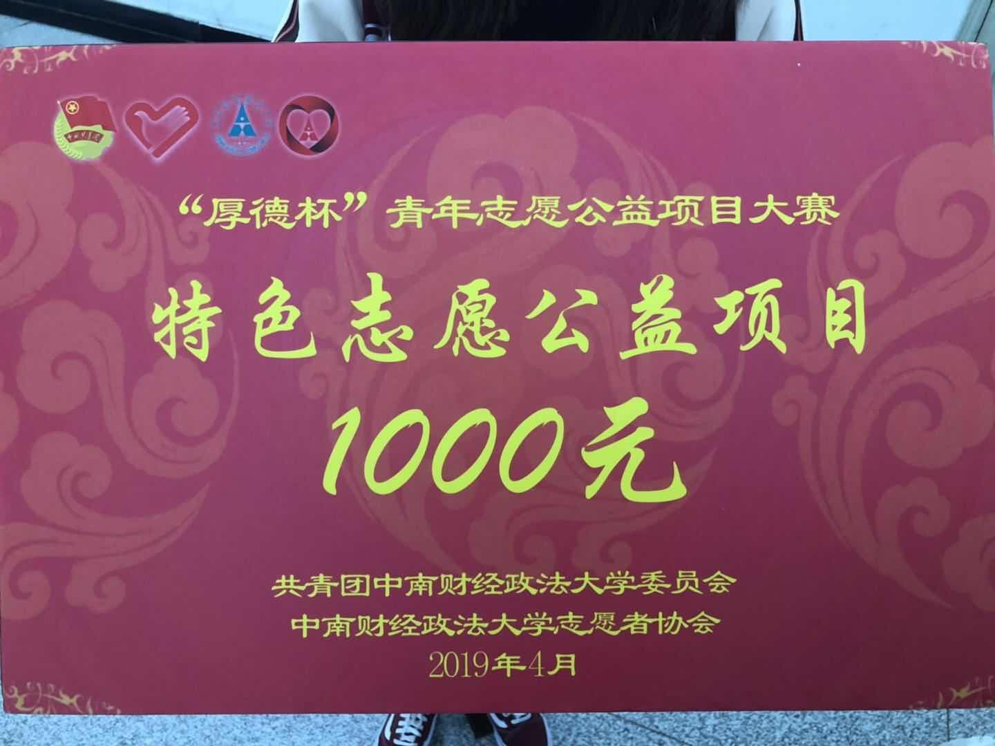 (通讯员:李家宸 姚元辰)2019年4月11日下午16时30分,中南财经政法大学第四届“厚德杯”青年志愿公益项目大赛决赛在南湖校区文泓楼落下帷幕。刑事司法学院志愿者协会项目策划部以优秀的志愿服务项目和精彩的答辩获得特色志愿公益项目奖,这是对我院志协优秀志愿服务成果的充分肯定。