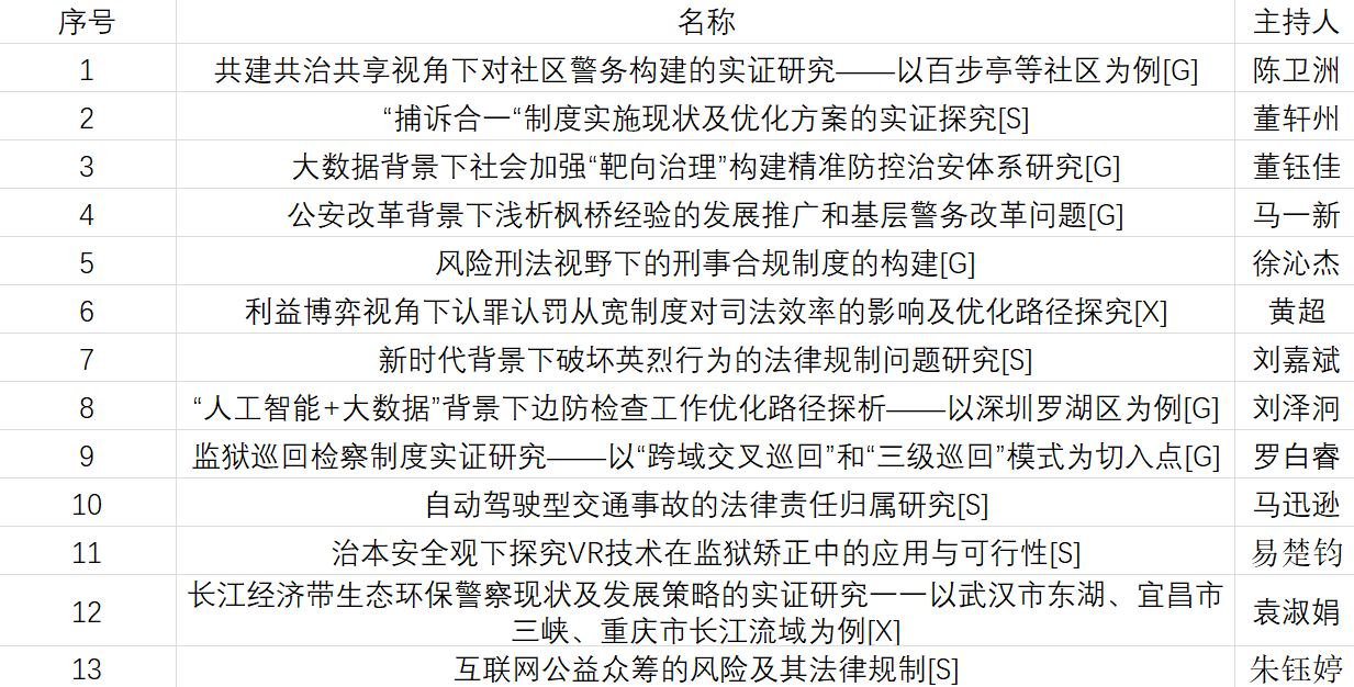 中南财经政法大学2019年大学生创新训练计划项目的申报工作已经结束,本年度“大创项目”采用网上申报。由学生自由组合项目团队,通过双向选择确定指导教师和项目团队负责人。确定项目后,由负责人线上填报项目信息。本年度我院“大学生创新训练计划项目”共收到32份申报材料,学院专家组按学校分配的指标数,在线上对每个项目进行盲审,经过严格评审、最后按得分高低排序,决定择优推荐 13个项目,其中国家级[G]6项,省级[S]5项,校级[X]2项。现公示如下: