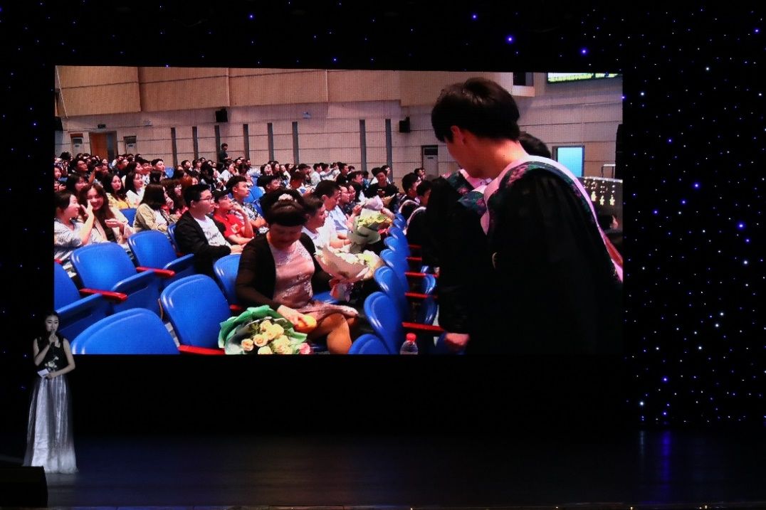 接着,毕业生代表纷纷下台将手中的鲜花送给到场的领导、老师们,现场画面令人感动。一捧鲜花,是对老师们最真挚的感恩祝福,更是对他们曾一路陪伴的谢别。“天下没有不散的筵席”,领导老师们的眼中,还是一如既往饱含殷切的期待目光,如今更多了由衷自豪与对大家的祝福;学生们除了感恩,则尽是不舍,还有学生眼泛泪光与老师紧紧拥抱不舍分开,老师拍拍学生后背肩膀安慰大家。如诗言:“慈母之心严父相,貌似威严心爱怜。刚柔相济并恩威,磨砺师生情无限”,朴素的师生情此时总让人觉得感动至深。