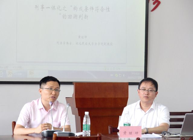 (学生记者:李秋昀袁梦)5月27日14时,“刑事一体化之构成要件符合性的回溯判断”学术讲座于文治楼二楼会议室成功举办。此次讲座特邀我院校友、湖北民族大学法学院黄继坤副教授担任主讲人,我院杨柳副教授担任主持人。周详教授参与了讲座,部分研究生到场聆听。