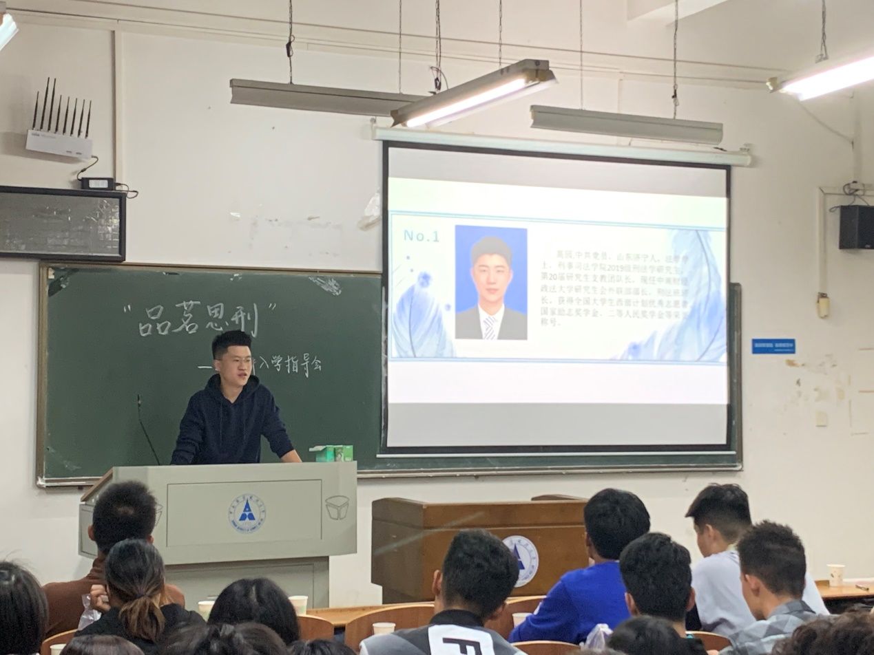 新闻网讯(通讯员 陈曌浒 杨思妤)茗,苦而回甘;刑,严而立身。为了让19级新生更快熟悉大学生活方式,树立自己的目标,在新起点做好人生规划,以最好的状态投入到学习中,在院内营造浓厚的学术气氛,我院学生会学术实践部于10月17日晚18时30分在文澜楼308教室举办了“品茗思刑”经验分享交流会。学术实践部特别邀请到了19级刑法学研究生高园,19级侦查学研究生宋鉴,18级刑法学研究生庞万腾三位优秀的师兄为19级新生介绍自己在学习,生活,时间管理与生涯规划等方面的经验心得。