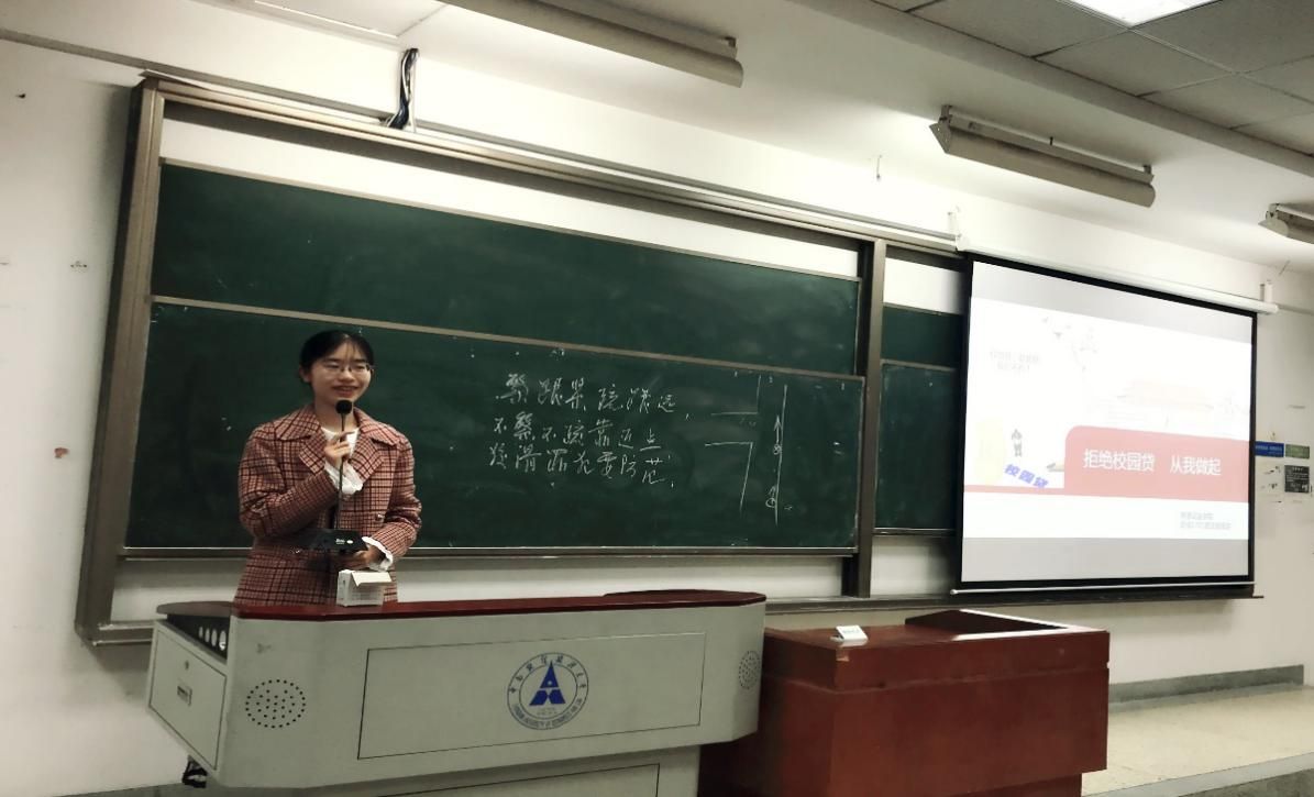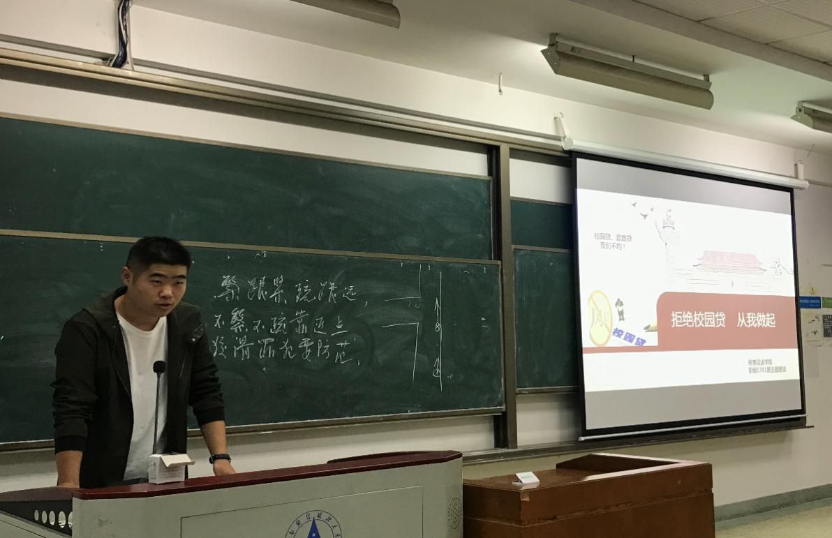 20:05时,副班长肖帅作为本次班会主持人,宣布班会开始。首先,他为大家介绍了“非法校园贷”的主要类型和迷惑手段,并以身边同学的几起真实案例具体展开介绍“非法校园贷”的陷阱和危害。随后,又为大家讲述了防范“非法校园贷”的措施和正规的贷款渠道。