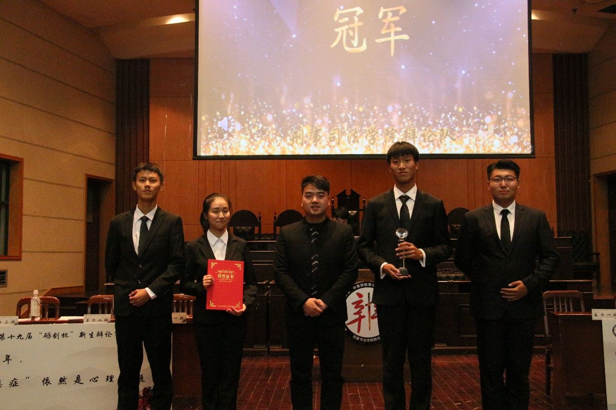 比赛结束后,各位评委对精彩的比赛作了细致的点评,同时正反双方对评委和观众的提问也做出了详细回答。在之后的颁奖仪式上,评委们为本届冠亚季军颁发了证书,砺剑辩论队历届队长为辩手们举行了受徽仪式,刑司辩论队“辩穷天问,剑托侠魂。砺德砥行,武布乾坤”的精神薪火相传。最后,评委们与本届砺剑杯选手合照留念,鼓励他们更上一层楼。此次新生辩论赛上辩手们沉稳机敏的辩风和睿智灵活的答辩展现出刑事司法学院新生们辩论场上的非凡风采和无限活力,期待未来的刑司辩论队站上更大的舞台,展现我们刑司人的砺剑辉煌!