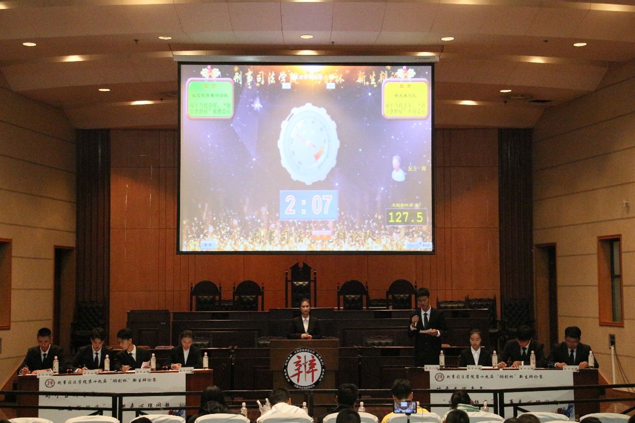 新闻网讯(学生记者:马登岳 编辑:李若宁)10月26日晚上七点,刑事司法学院于文泰楼模拟法庭(一)举办了第十九届“砺剑杯”新生辩论赛决赛暨颁奖典礼,此次比赛由我院辩论队的王源强、田雨琳主持,全体大一新生参加了此次活动。