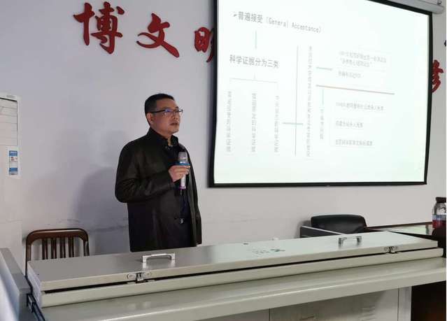 讲座伊始,杨教授首先向同学们介绍了自己的研究领域和研究成果。杨教授在博士学习阶段主要开展计算机视觉方面的研究,从教期间一直从事痕迹检验、犯罪现场勘验与重建、数字图像处理、机器学习、数据挖掘和数据处理技术在痕迹检验中应用等方面的研究。结合自己的研究专长,杨教授还简要介绍了背景消除及手印增强图像处理软件、线条工具痕迹虚拟比对显微镜比对软件、剪切痕迹定位与制作装置、线条痕迹制作装置、线条工具痕迹图像中线条精确定位与提取方法等方面的知识。紧接着,杨教授主要介绍了法庭科学证据应用及其科学问题。杨教授从法庭科学的概念引入,介绍了刑事诉讼法关于证据类型的规定,根据刑事技术、证明目的、专家证言等不同标准对证据的不同分类以及Frye和Daubert标准。