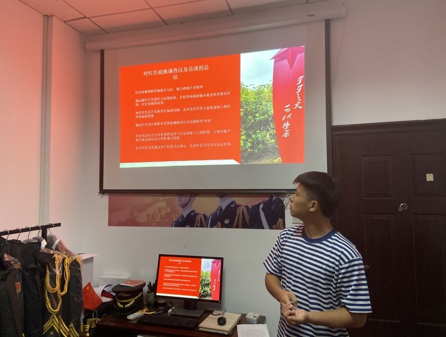 第七位进行报告的是周洲,他和他的团队将《探究红色景点文化传承,感悟新时代青年新使命——以重走青年毛泽东游学路为途径》作为课题?!岸镣蚓硎?,行万里路”。他们重走了毛泽东同志于1917年在湖南农村的调研之路。在行程中,他们深入细致地考察了沿途红色文化景点保存情况,并在当地进行调研,收获颇丰。