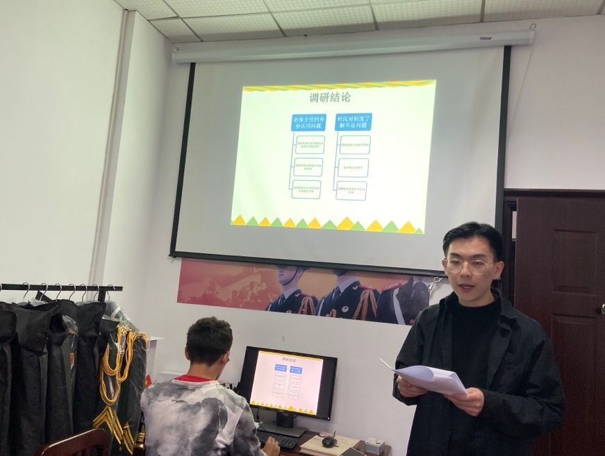 第二位进行报告的是陈卫洲,他和他的团队调研的是《数字乡村战略背景下对农村普法现状与优化方式的调查研究——以山东菏泽、湖北崇阳等农村地区为例》这个课题。他们聚焦农村普法工作现状,提出相应方案,得到了指导老师杨柳的高度肯定。