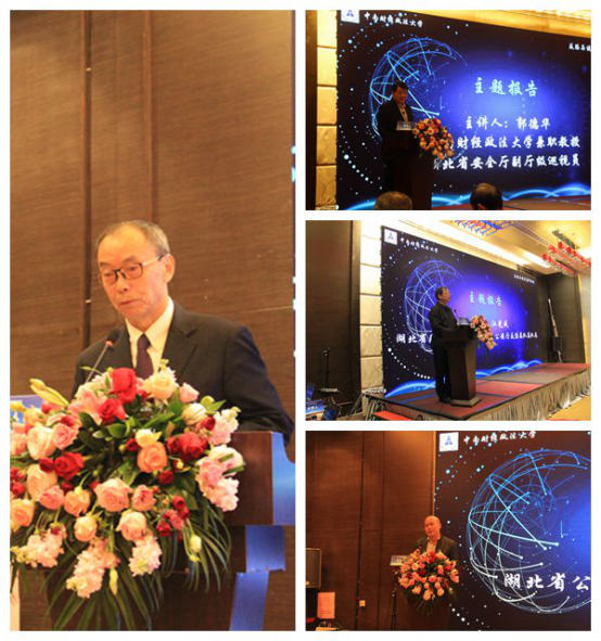 开幕式结束后,何家弘教授主持反恐与侦查高峰论坛的主题报告,反恐与侦查领域的实务专家主讲。湖北省公安厅反恐总队总队长江光成向大会作了《我国反恐斗争特点与解决策略》的主题报告,分析爆恐犯罪形成过程与暴恐犯罪特点,并提出反恐体系的构建框架。中南财经政法大学兼职教授、湖北省安全厅副厅级巡视员郭德华作了以《侦查谋略》为主题的报告,向与会代表分享其在侦查审讯中的实战经验与理论总结。湖北省公安厅刑侦总队重案支队长王海军《电信网络诈骗犯罪的现状与防控》的主题报告,阐述对新时代新型犯罪侦查工作的深入思考。