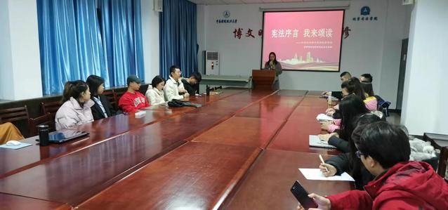 (学生记者:干莹、王渠成)为弘扬宪法精神,厚植爱国主义情怀,2019年12月4日,正值第6个国家宪法日,我院研究生在文治楼二楼会议室举办“宪法序言,我来诵读”活动。