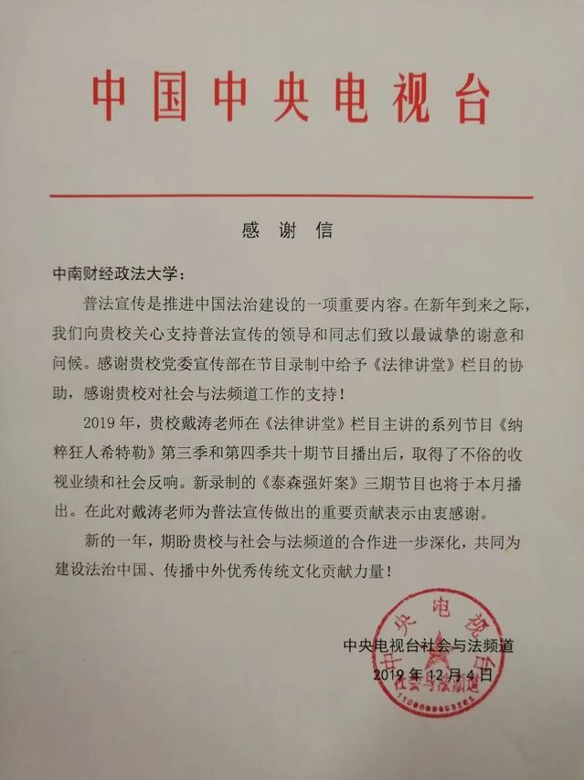 中央电视台社会与法频道给学校发来感谢信,信中肯定了学校在主讲人选拔、节目录制播出、联合推广等方面提供的支持,尤其是对《法律讲堂》栏目的支持,高度评价学校戴涛老师2019年在该栏目所录制节目的社会反响。学院与央视社会与法频道自2011年开始合作,推选出戴涛、夏朝晖等老师作为主讲人,戴涛从2011年至今已经录制100多期节目,是该栏目的知名主讲人。