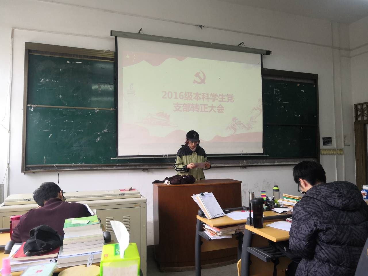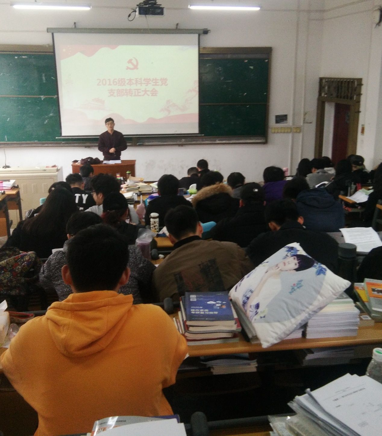 2019年12月23日上午10:00, 我院2016级本科学生党支部预备党员转正会议在电教楼201召开。2016级本科学生党支部全体党员参加会议,会议由党支部书记卓张鹏老师主持。