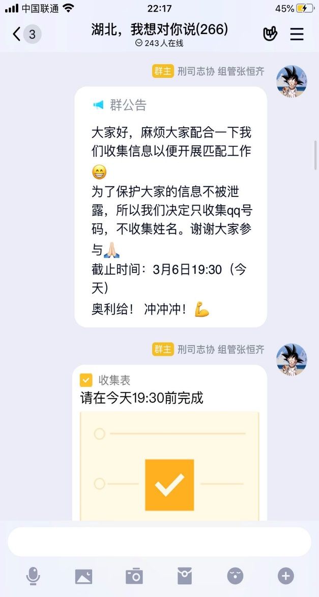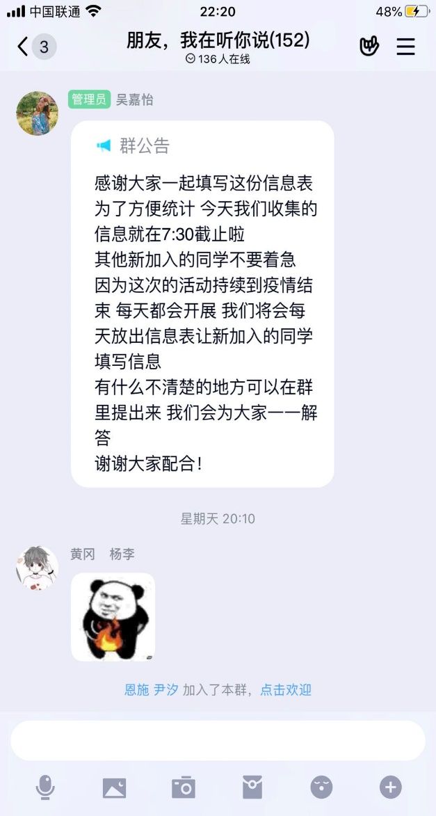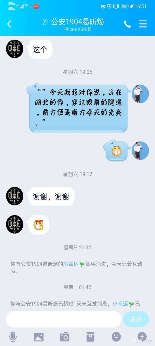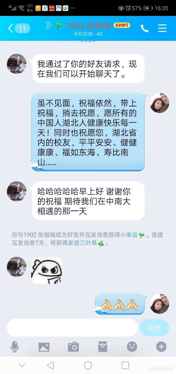 新闻网讯(通讯员 张振嘉 吴嘉怡 韩竞逸)在此抗击疫情时期,为响应学院团委关于在全院开展“战‘疫’‘刑’动”特别主题团日活动的通知,鼓舞我院师生抗疫斗志,我院志愿者协会在三月份特开展了为期18天的“湖北晚安计划”活动,通过QQ架起湖北省内与省外的沟通桥梁。由来自省外各地的同学与身处疫情中心的湖北同学一对一结对子,每日送去祝福与问候,使同学们居家也能感受到温暖,隔离病毒而不隔离爱。