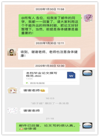 我院教师们在完成教学的同时,也积极按照毕业论文(设计)工作的时间节点进行着本科毕业论文的指导工作,通过QQ、微信、邮件等各种网络形式与学生保持联系、进行沟通。