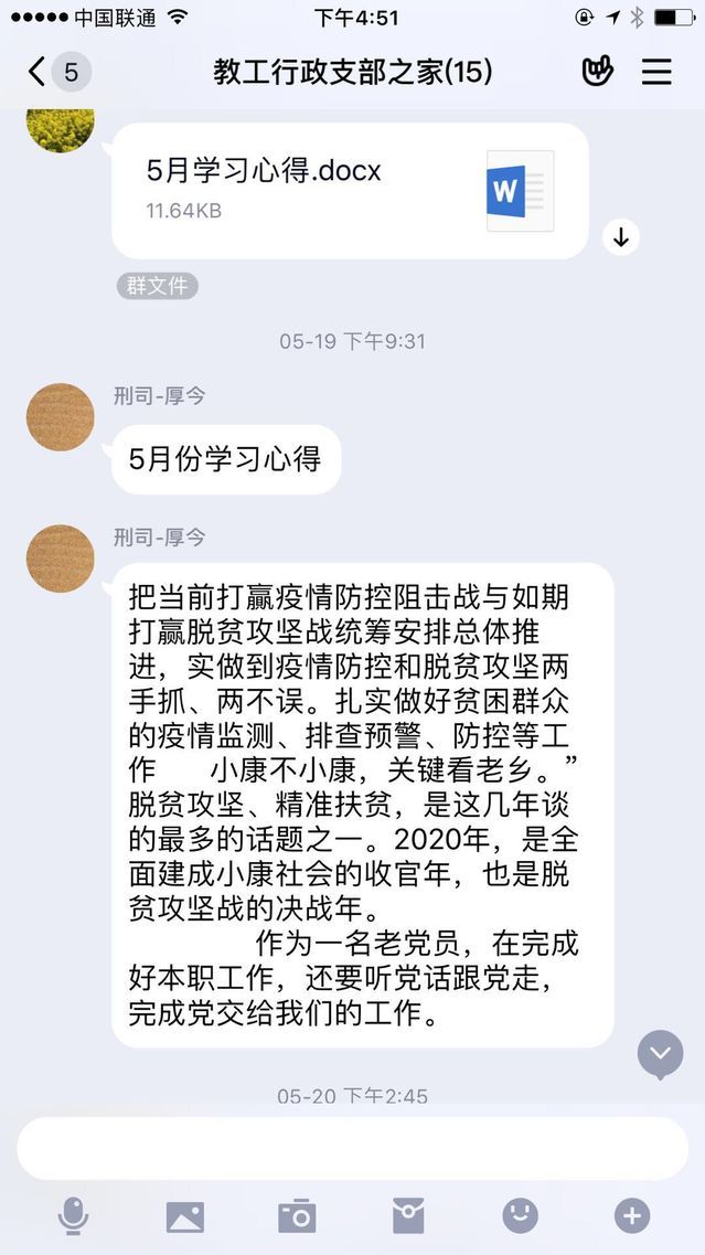 新闻网讯(通讯员王晓丹)为深入学习贯彻习近平总书记关于全面从严治党的重要论述精神,及时学习传达2020年教育系统全面从严治党工作视频会议和学校2020年全面从严治党工作会议精神,抓牢党风廉政建设,推进全面从严治党,营造风清气正、干事创业良好政治生态。2020年5月18日,刑事司法学院教工行政党支部以“深化全面从严治党,决战决胜脱贫攻坚”为主题召开党日活动,为提升学习效果,本次活动以自主学习、支部集体学习及线上讨论的形式开展,支部全体同志参与本次活动。