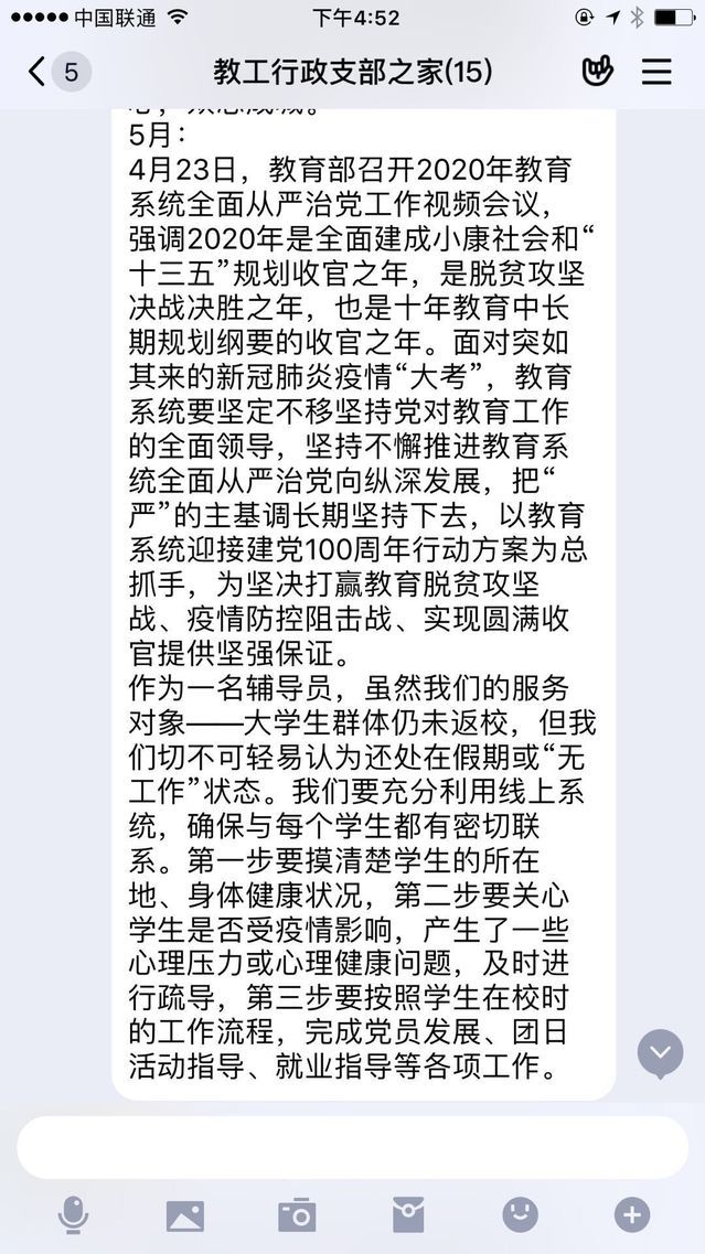2020年是决胜全面建成小康社会、决战脱贫攻坚之年,是“十三五”规划收官之年,也是十年国家中长期教育改革和发展规划纲要临近尾声的一年,我们要坚定不移地以习近平新时代中国特色社会主义思想为指导,切实增强“四个意识”、坚定“四个自信”、做到“两个维护”,勇担使命,稳中求进,在统筹抓好疫情防控和复工复学工作过程中,充分发挥党支部战斗堡垒作用和党员的先锋模范作用。
