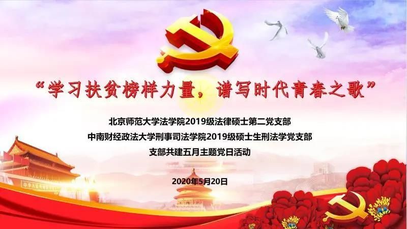 为深入学习贯彻习近平总书记关于决战决胜脱贫攻坚的重要讲话精神,5月20日我院硕士生2019级刑法学党支部结合本月党日活动主题,与北京师范大学法学院2019级法律硕士第二党支部联合开展“学习扶贫榜样力量,谱写时代青春之歌”支部共建五月主题党日活动。