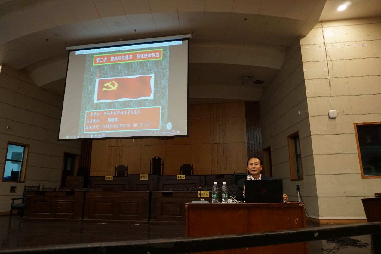 新闻网讯(学生记者 聂一雄 石玥 罗悦华)2020年10月22日下午2:30,刑事司法学院下半年入党积极分子、党员发展对象和预备党员培训班在文泰楼模拟法庭(一)正式开课。我院研究生及本科生共计有310余名入党积极分子,发展对象和预备党员参与党校培训。本期党校邀请了我校会计学院党委书记殷修林教授、马克思主义学院何西瑞教授,姚桂荣教授和公共管理学院徐双敏教授等进行授课。本期党校培训内容包括《坚持党的全面领导,加强党的建设》、《提高党性修养,强化使命担当》、《中国共产党为什么能取天下:中华人民共和国成立的历史必然性》、《不忘初心,紧紧依靠人民》和由各年级支部自行开展的主题实践活动。