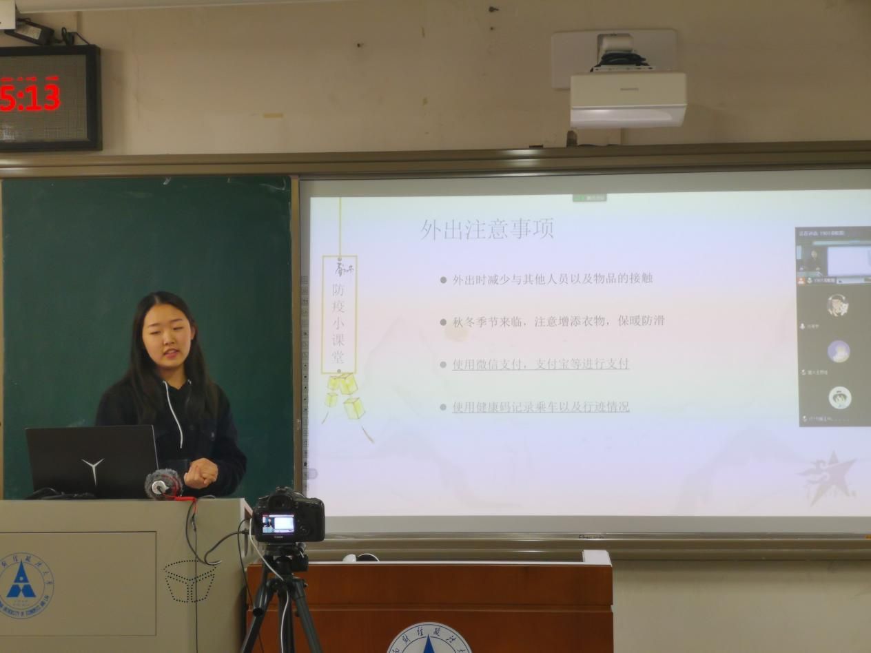 为了响应学校疫情防控要求,切实做好防控指示,保障参与人员人身安全,本次活动首次采取线上直播方式,与武汉市洪山区保利心语康馨养老院进行联动直播?;疃潦?,讲解员王曼溪以生动活泼的语言从口罩的使用方法、良好的生活习惯、外出注意的事项、适宜室内锻炼的活动等方面展开讲解,为秋冬疫情反弹做好相应准备,时刻绷紧安全之弦。在讲解过程中,讲解员随机插入趣味知识,让原本气氛热烈的课堂更上一层楼。