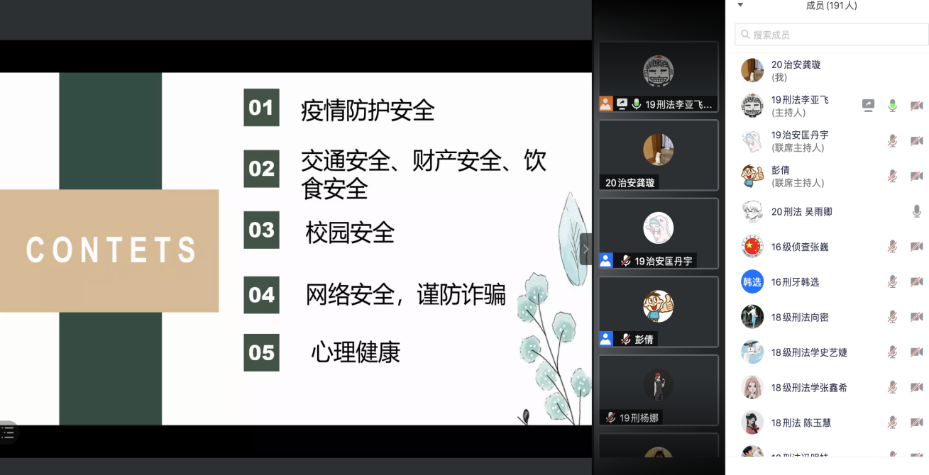 会议分为两个部分,第一部分研会主席团成员李亚飞从疫情防护安全,交通、财产、饮食安全,校园安全,网络安全,心理健康五个方面展开安全教育,提醒同学们临近寒假假期,安全意识不“放假”,叮嘱大家继续做好个人防护、注意宿舍卫生和个人健康,牢记10凡是6个一律,提高防诈骗意识,做好疫情防控、安全防护。