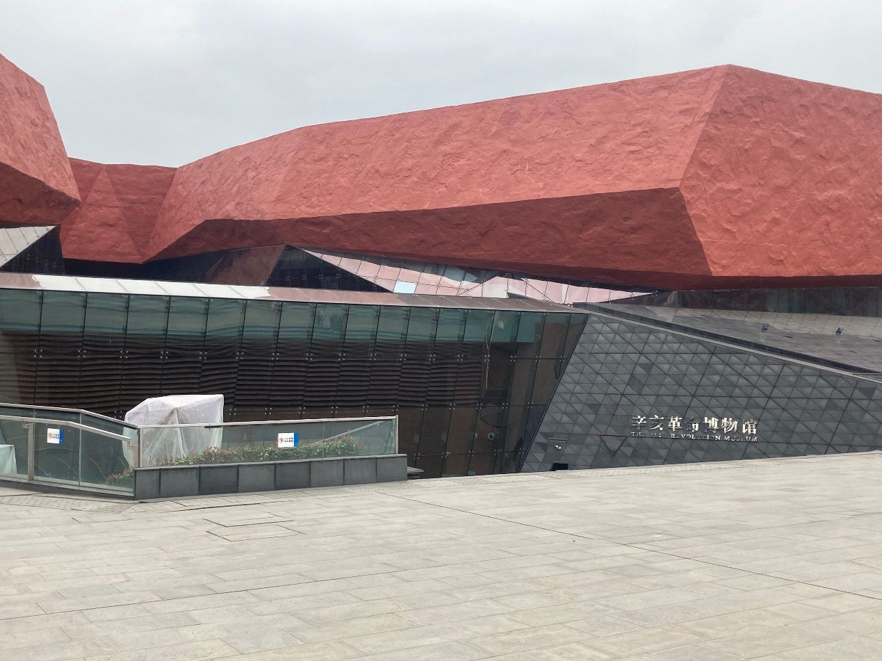 第一站我们来到了武汉辛亥革命博物馆,来到博物馆,首先便被其鲜明的标志性和肃穆凝重的风格深深吸引,该博物馆融合了中国传统建筑和现代手法,从正面看,高台加大屋顶的架构,传承了中国建筑“双坡屋顶”和飞檐翘角的特质;侧面看,三块几何形拼出的“破土而出”意象,颂扬了敢为人先的首义精神。