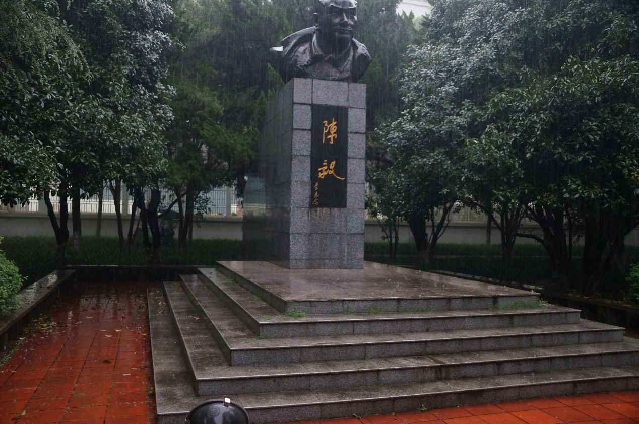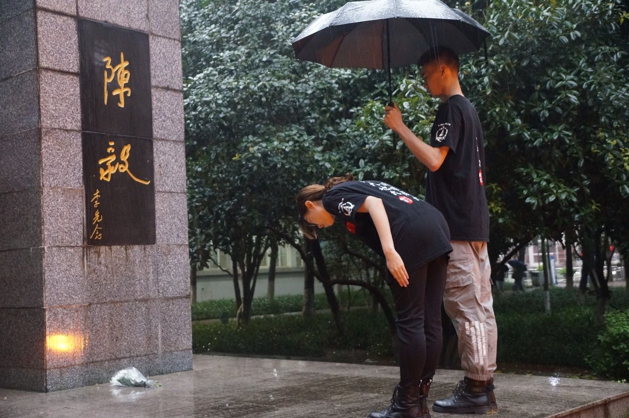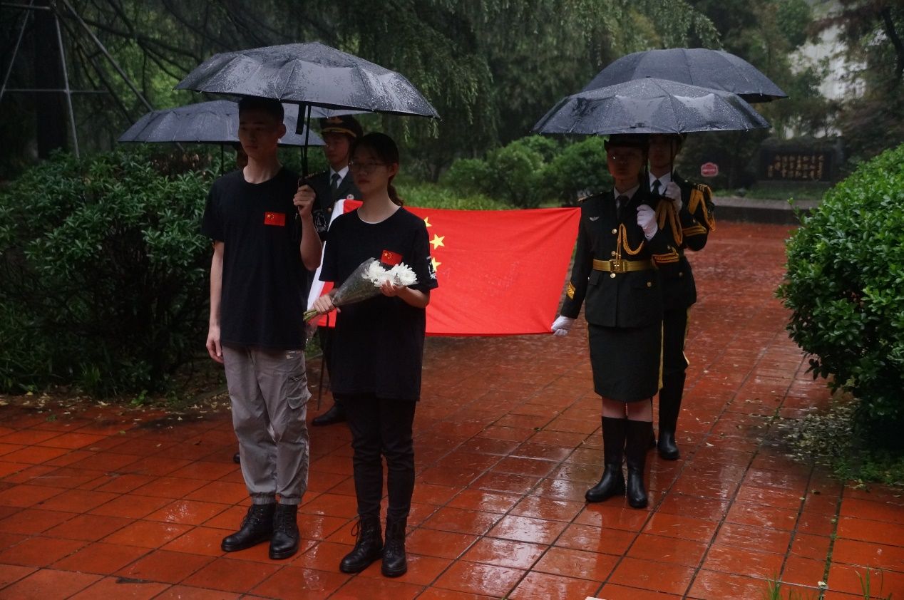仪式开始,身着国旗护卫队文化衫的两名队员,一人手捧白菊,一人举着雨伞,心怀对于英雄先烈崇高的敬意,缓步走上台阶,放下花束,并向陈毅将军像鞠躬致意,之后转身下台,向陈毅将军像行注目礼。