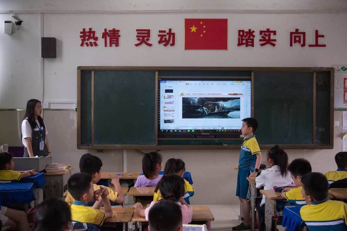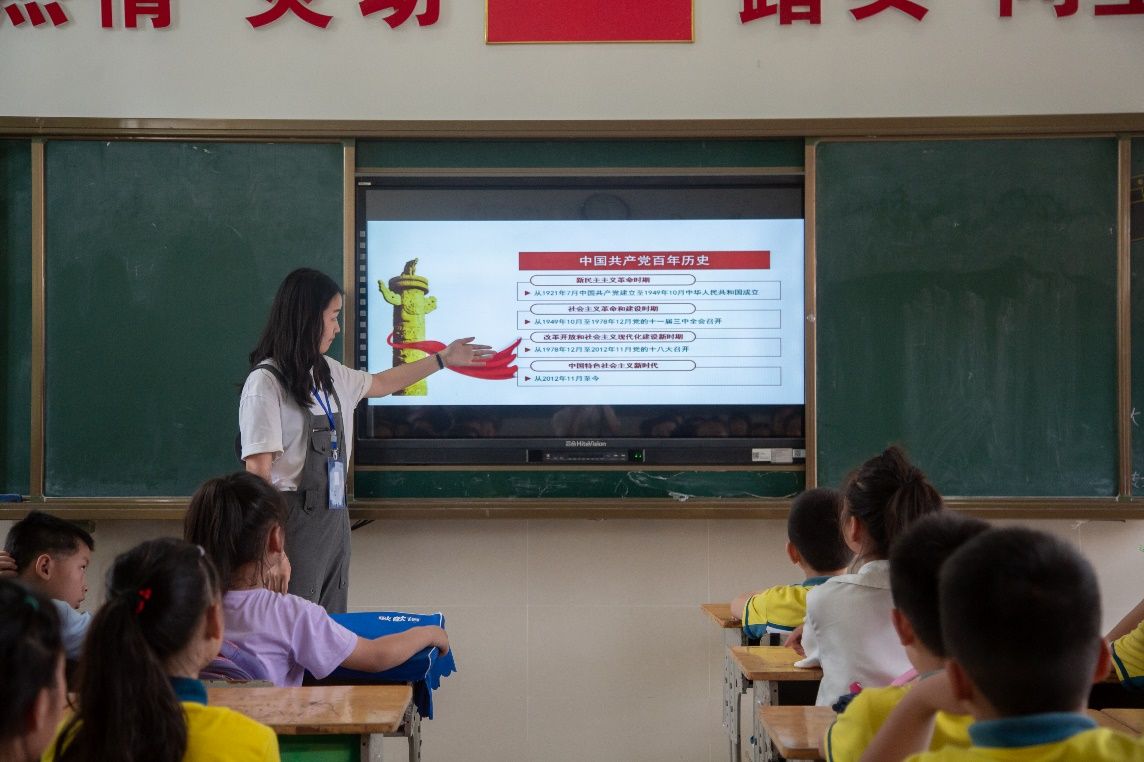 上课铃声敲响,志愿者小老师以中国共产党成立100周年作为引入,向孩子们表明本次课堂主题的深层涵义。并用一份简短的视频,在课堂伊始,向大家展示了党百年来的每个重大历史瞬间。视频逐步高昂的节奏,吸引孩子们的视线。他们以各自惯常的姿态,全神贯注于每幅画面。有时,进度条行进至其所熟知的场景,会不自觉而随之喊出它的名字“抗日战争!”“香港回归!”“抗疫!”。抑或轻拍同桌肩膀,将自己所知所感娓娓道来。艳阳的明媚都不及其光辉夺人,生机盎然。