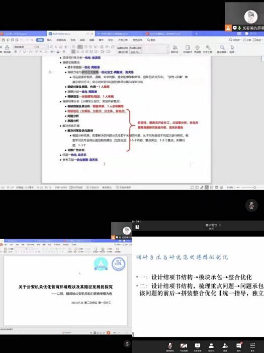 在结项阶段,小队成员细心归纳、梳理各自的研究成果,把在线上调研、线下走访、实习实践、文献阅读的所得综合起来,深入分析其中的问题与原因,努力构思其解决对策与优化方案。小队成员系统地综合整理了各地公安机关优化营商环境的思路图,将各地的优化举措进行整合。这其中,不仅有公安机关直接涉企工作的归纳,包含着便民利民的专门服务以及科学的监督与检查,还有整套警企联动机制的共建共享。而到了问题分析,小队成员也注意到了企业群众对政策了解、信息化程度不高、执法部门态度固化、重审批轻监管等问题。社会实践,重在致用。小队成员从培训课程建设、廉政文化教育、监督检查、警企关系以及法治思维建设等诸多方面提出了优化方案,并对其进行了可推广性评估。不仅如此,小队成员还附带研究了在营商环境优化中公安机关自身机制调整、公共服务理念规范、城市规划科学等问题,来构建完整的体系。