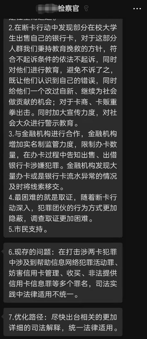 线下部分,项目成员利用实习期间,深入公检法机关的实习平台,与专业人员交流电信诈骗现况,并针对“断卡”行动展开探讨研究。工作人员结合自身的办案经验,向我们介绍了目前电信诈骗的严峻形势与湖北省打击治理电信网络新型违法犯罪工作暨“断卡”行动的开展状况,对于在打击“收买、非法提供信用卡信息资料犯罪团伙”时所遇到的重难点进行了分析,阐述了当前对于异地倒卖、无业游离人员的处理困境,并同我们共同探讨了“断卡”优化路径。