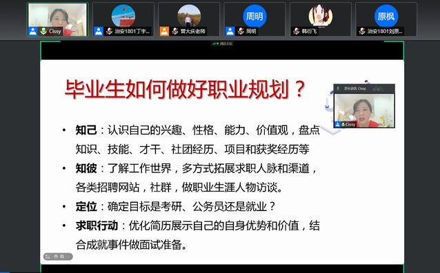 为了指导2022届毕业生更好的进行职业规划、人生规划。2021年9月15日,刑事司法学院治安学专业开展班级素质导师指导会。刑事司法学院治安1801班级素质导师曾大庆老师主持了本次会议,出席本次会议的有国家一级就业指导师刘敏老师和平安保险武汉公司老总、中南财经政法大学杰出校友周明。