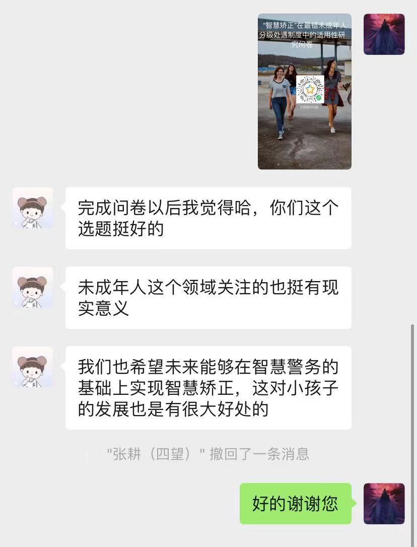 实习过程中我们将问卷发放给了当地的公安民警和检察院的工作人员,他们在填完问卷后,很多工作人员都能认为针对罪错未成年人分级处遇制度的探索,是很有必要的。其中武穴市四望镇的年轻民警也很肯定了我们的问卷调查。
