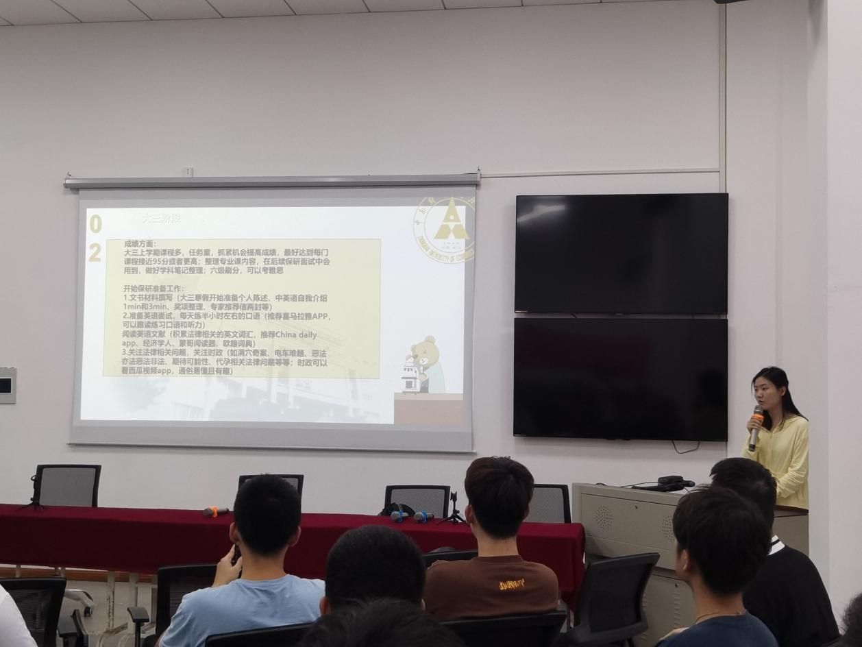 党萌师姐的经验分享主要围绕大二学年和大三学年两个阶段展开,重点讲述了自己在成绩、科研、社会实践和保研准备工作等方面的心得体会,可谓干货满满。她重点强调,英语和法学的学习是我们专业大学本科四年学习的重要一环,不能依赖突击速成,而是要每天都学习,多看多记。只有这样才能提高我们的专业素养,为未来的人生道路打下坚实基础。此外,党萌师姐还针对几个比较多同学提出的“人气问题”,包括考研与保研的区别和建议,双学位的建议和学硕与专硕等等依次详细解答。台下老师和同学们认真倾听,大家积极做笔记,分享会交流氛围良好。