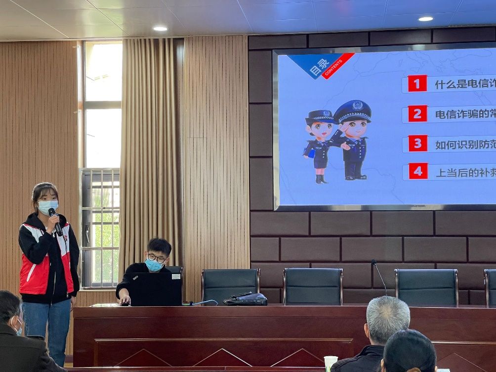 第二个环节是由志愿服务部的志愿者们精心准备的防诈小剧场。这段小短剧讲述了一个现实中真实发生的骗局:一男子通过骗取到另一男子父母的电话,对其父母谎称其儿子手术缺钱,从而骗取老人大量钱财。这就是社会上针对老人最常用的诈骗方式——冒充其亲人进行诈骗。志愿者们有声有色的表演,生动地再现了这一场利用亲属身份进行的骗局。“妈,啥手术啊,没手术!你被骗啦!”剧中 “儿子”惊诧的语气引起了老人们的阵阵笑声。笑过之后,爷爷奶奶们也陷入了思考,可能在思考着自己今后遇到这种情况该如何去应对。不管老人们在思考些什么,但我们知道,这一段小短剧起到了它应有的作用,我相信老人们通过这种表演方式,能近距离见证到一次骗局的发生之后,不会再被同样的方式所诈骗。