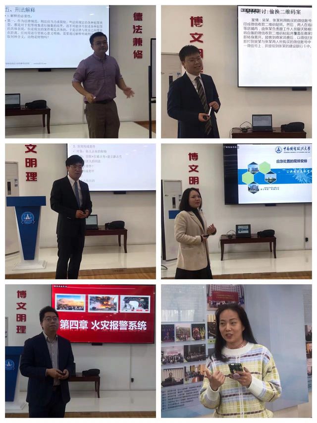 比赛正式开始,我院5位青年教师逐一进行20分钟的授课。第一位参赛教师张正宇就刑法解释进行讲解。第二位参赛教师姚培培讲述了财产犯罪疑难案例分析。第三位参赛教师王复春讲解了盗窃罪的客观构成要件。第四位参赛教师黎晓露就应急处置的现场安排进行课堂讲解。第五位参赛教师栾兴良以火灾报警系统的结构与使用方法作为课堂内容。