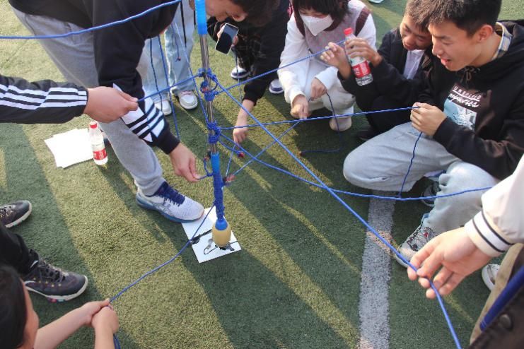 素拓中南带领员刘桐岳首先带领同学们进行热身游戏——贪吃蛇。同学们先随机进行石头剪刀布,当一方的同学赢了,则成为“蛇头”,输的人以及其后的“蛇身”队伍就并入该“蛇头”同学身后,将手搭在“蛇头”同学的肩膀上。直到活动场上的人全部缩并至两条长“贪吃蛇”后,两条长队相互连接,形成一个圆环。