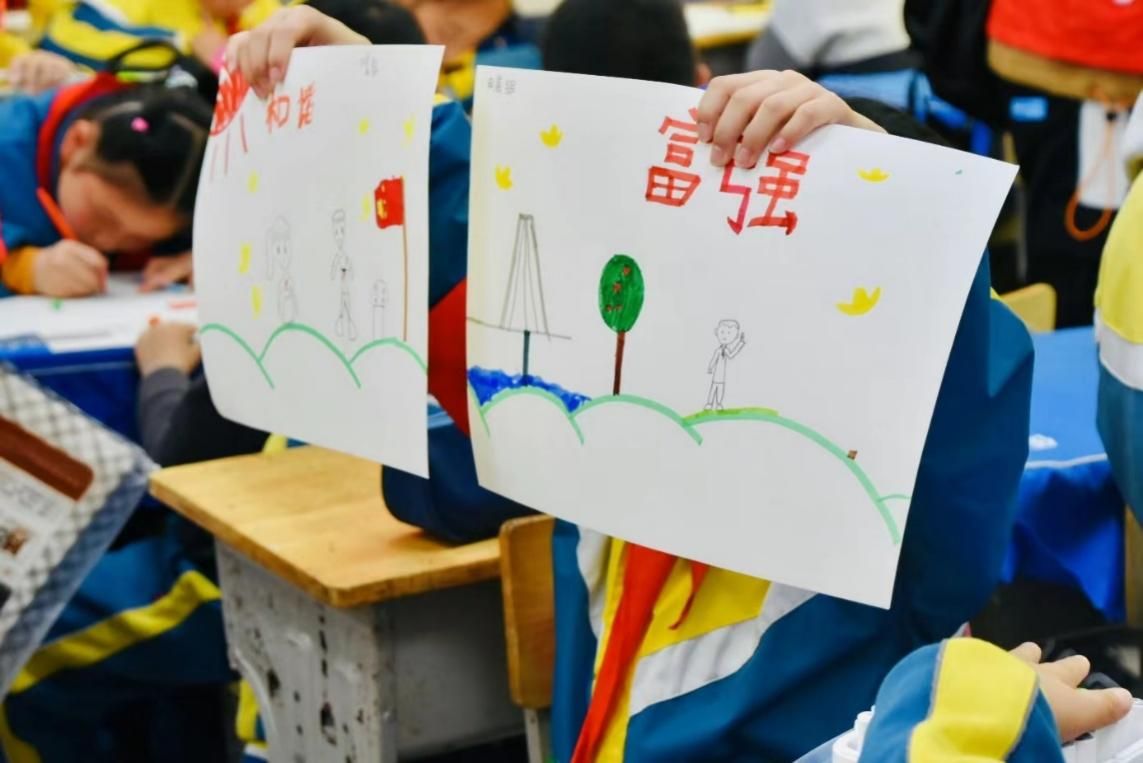 随后,第二部分课堂“展望未来”伴随着主讲人的引入缓缓展开,该部分主要由脱胎于“社会主义核心价值观”中国家层面的价值观的四个部分“富强,民主,文明,和谐”组成?!案磺俊奔础肮幻袂俊笔巧缁嶂饕逑执揖媒ㄉ璧挠θ蛔刺彩枪曳比俨?、人民幸福安康的物质基?。弧懊裰鳌奔础叭嗣衩裰鳌捌涫抵?/span>与核心是人民当家作主,是社会主义的生命,也是创造人民美好幸福生活的政治保障;“文明”是社会进步的重要标志,也是社会主义现代化国家的重要特征,更是实现中华民族伟大复兴的重要支撑;“和谐”是中国传统文化的基本理念,是社会建设领域的价值诉求,是经济社会和谐稳定、持续健康发展的重要保证。随着主讲人的深入讲解,孩子们求知的脸庞上也由最初的疑惑,转变为恍然大悟,最后浮现出对光明前景的憧憬与期盼。