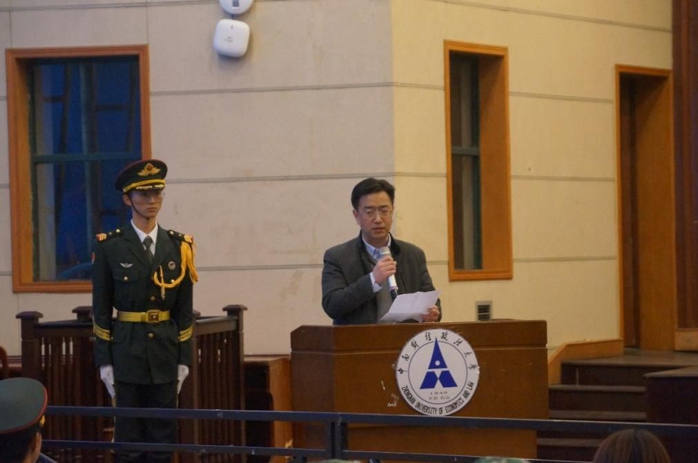 在仪式正式开始后,中南财经政法大学刑事司法学院党委书记张志刚致开幕词,以《国旗之下,青春激扬》为题,既肯定了过去一年中老队员刻苦训练的成果和为国护所做出的贡献,同时向47名中南大国护第20届新队员表示热烈的欢迎。书记希望20届新队员能够加强训练,完善队列动作水平,完成形似到神似的转变,将国护的精神进行传承,用心捍卫国旗的无上荣耀,成为一名光荣的国旗卫士。同时书记还强调作为新时代的大学生,要牢记学习的重要性,还有丰富的课余活动和比赛,要合理分配自己的课余时间,调整好学习、训练的关系,用在国护训练练就的坚毅与勇敢,在学术上攻城略池,在各大平台绽放光彩。