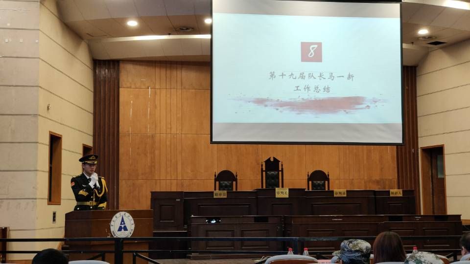 在主持人宣读了中南财经政法大学国旗护卫队第二十届执行队委名单后,中南财经政法大学国旗护卫队第十九届队长马一新对过去一年的工作以《青春向党,国旗飞扬》为题从思想建设、组织建设、文化建设等方面进行了汇报总结。在思想建设方面,在过去的一年里国旗护卫队依托国旗文化研究中心、国旗护卫队党支部工作运行机制,学党史、铸初心,内化于心、外化于行,利用国护具有的独特优势,引领全校师生坚定理想信念,助力中南大爱国主义教育事业的发展;在组织建设方面,研究相关规定并结合国旗护卫队的实际情况,自主完善《中南财经政法大学国旗护卫队党支部工作条例》,促使党支部工作的科学化、制度化、规范化,充分发挥国旗护卫队党支部的战斗堡垒作用,始终保持党的先进性,保证队伍干部的高标准、高质量。在文化建设方面:队伍从理论实践、学术倡导、综合技能三方面抓起。利用队伍涵盖各个学院的优势,交叉组队,多元化参赛,同时举办队员学术交流分享会,让队员做到“先学带后学”。使国旗护卫队队员积极参加各学院博文、大创等比赛,并且纷纷斩获佳绩。开展学党史系列活动,创办党史融入升旗、生活、学习的活动,增强对队员党性的培养,提高党史学习教育的积极性,以身作则,宣传并动员中南大学子积极参与党史学习教育,明确作为新时代青年的使命。