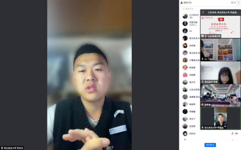 接下来,西北政法大学学生会主席罗会杰谈到,在疫情肆虐之下,他毅然向党组织提出组建公安志愿队,以在考研前夕进行核酸采集和测温等工作。这支由积极分子和党员组成的先锋队呕心沥血,不喊苦累,意志坚定,在困境中之下他们就是不退缩、不屈服,英勇抗疫。