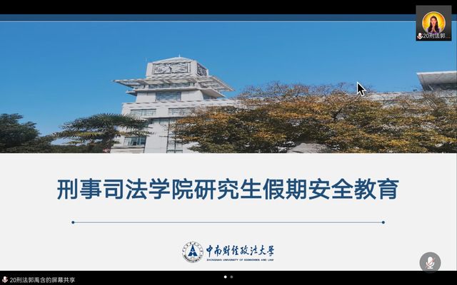 (通讯员:朱炜妍)在寒假即将到来之际,为做好寒假学生相关工作,提高研究生安全意识和自我防护能力,我院于1月11日下午3:00召开线上研究生安全教育会议。研究生辅导员彭倩老师和全体研究生参加,2020级刑法学硕士生郭禹含主持本次会议。