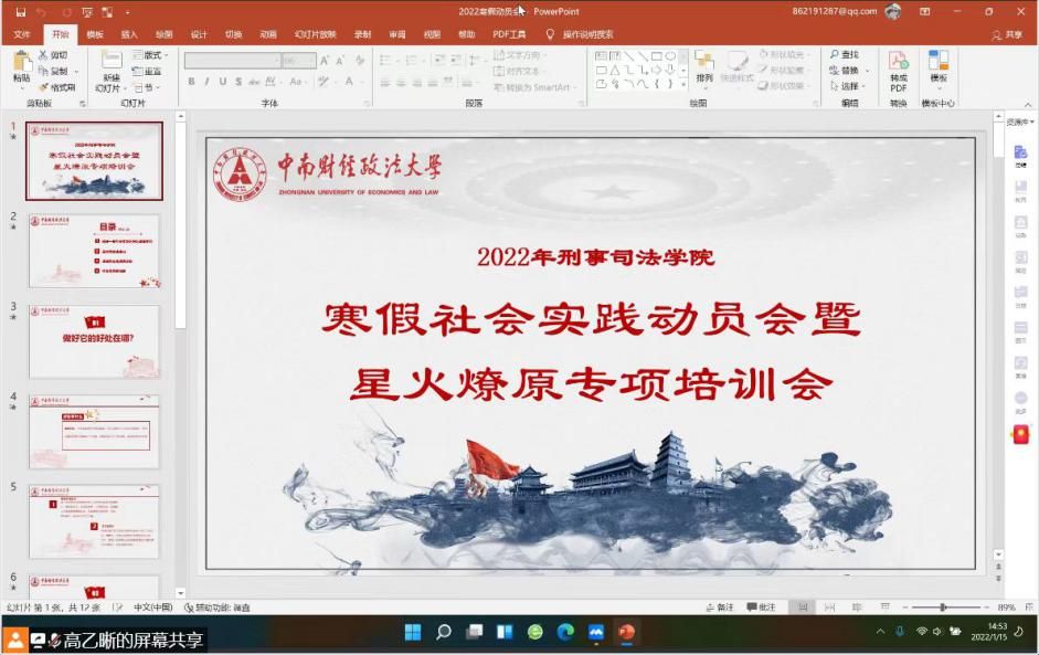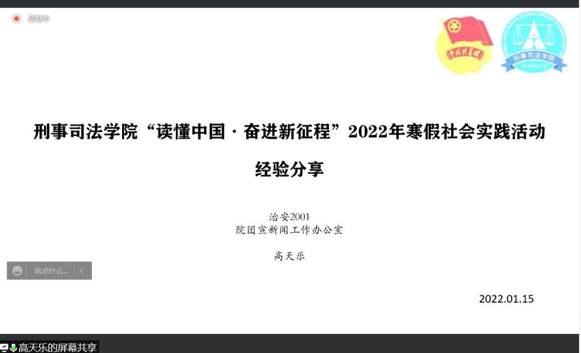 新闻网讯(学生记者 金雯星 齐敬凯)1月15日下午3点,刑事司法学院寒假社会实践线上动员会暨星火燎原专项培训会于腾讯会议召开。本次会议由院团组创业实践办公室负责人高乙晰主持,主要涵盖寒假社会实践介绍、星火燎原计划专项培训以及优秀代表分享经验三个部分。