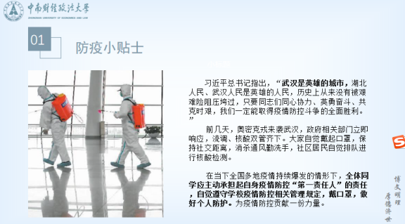 首先,王江昕围绕武汉这座英雄城市的相关防疫成果展开,号召广大同学们主动承担自身疫情防控第一责任人的责任,做好个人防护,遵守学校管理规定,巩固来之不易的防疫成果。接着,他从防疫知识、校园安全、防范诈骗等安全事项,提醒同学们提高安全意识,共同守护平安校园。最后,王江昕详细介绍了学校常态化疫情防控的相关政策和要求,并就离校、返校申请程序一一进行说明。