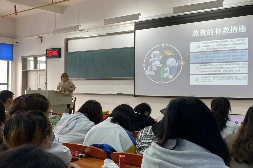 在失眠版块结束后,主持人进入到了熬夜版块的讲解。在开始讲解之前,主持人先引入了一个新的概念——“晚睡”,通过对熬夜和晚睡比较,同学们更深入的了解了两者的本质区别。随后,主持人形象地向同学们解释熬夜的危害,并以此告诫同学们减少熬夜频率。而在这一板块的最后,主持人也详细地列出了熬夜过后的补救措施,使同学们掌握了更多关于缓解熬夜影响的方法