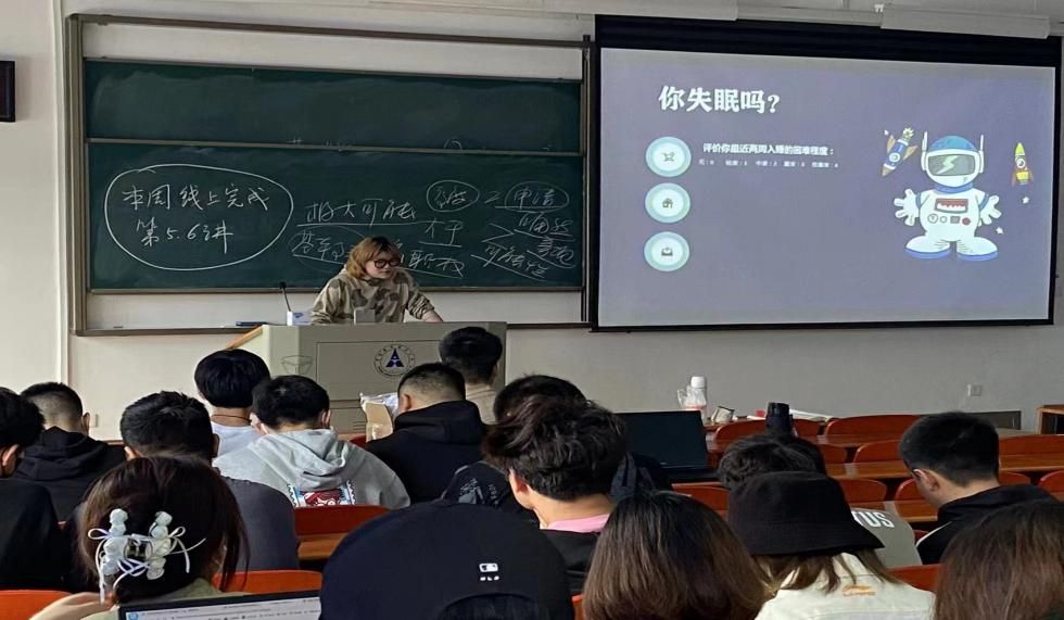 班会伊始,由主持人宋艺鋆同学介绍班会主题——“大学生如何正确认识和对待睡眠”,并从失眠的角度引入本次班会。通过一系列简单的调查,同学们在主持人的带领下,对各自的睡眠状况有了更全面清晰的认识,同时同学们也加深了对失眠的理解,了解到了失眠所带来的负面影响。