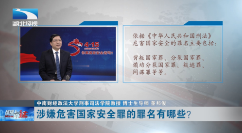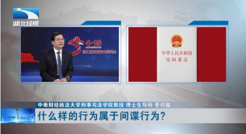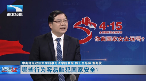 新闻网讯(通讯员 邓翠平)2022年4月15日是第七个全民国家安全教育日。我院副院长、博士生导师董邦俊教授受邀做客湖北经视《经视说法》栏目,向社会大众宣讲国家安全知识。