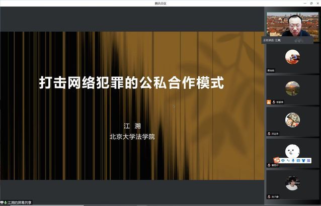 (通讯员 张颖果翟尚铭)5月6日下午,北京大学法学院江溯老师为我院开展“博导讲坛”第二场,讲座主题为“打击网络犯罪的公私合作伙伴关系”。本次讲座通过腾讯会议平台举行,由北京大学法学院博士生导师江溯老师主讲,由刑事司法学院副院长董邦俊教授主持。湘潭大学黄明儒教授,刑事司法学院童德华教授、何正泉、李淑兰、姚培培等多位老师参加。此次讲座有300余人参与,其中不乏北京大学、中国政法大学等高校的法科学子,侧面反映出我院“博导讲坛”的影响力之强。