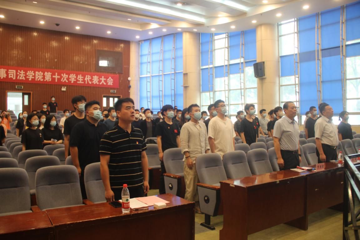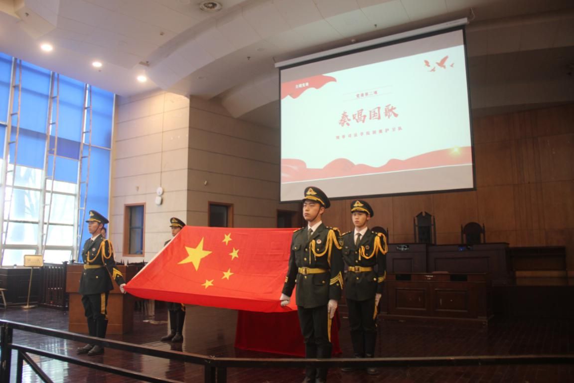 上午10:00,由中南财经政法大学国旗护卫队出旗,全体起立,奏唱国歌。