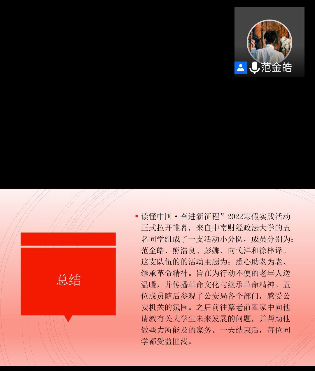 随后,2022年寒假燎原计划的优秀分队鄂行小分队负责人范金皓对其寒假进行的社会实践进行了展示分享。鄂行小分队的寒假燎原计划主要围绕对于革命老党员的帮扶以及访谈展开。在开展过程中,鄂行小分队的几名成员去到了革命老党员的家中,帮助其打扫卫生,并就革命精神的探讨,结合专业特色的相关问题对这位老党员进行了采访并形成相应的调查报告。