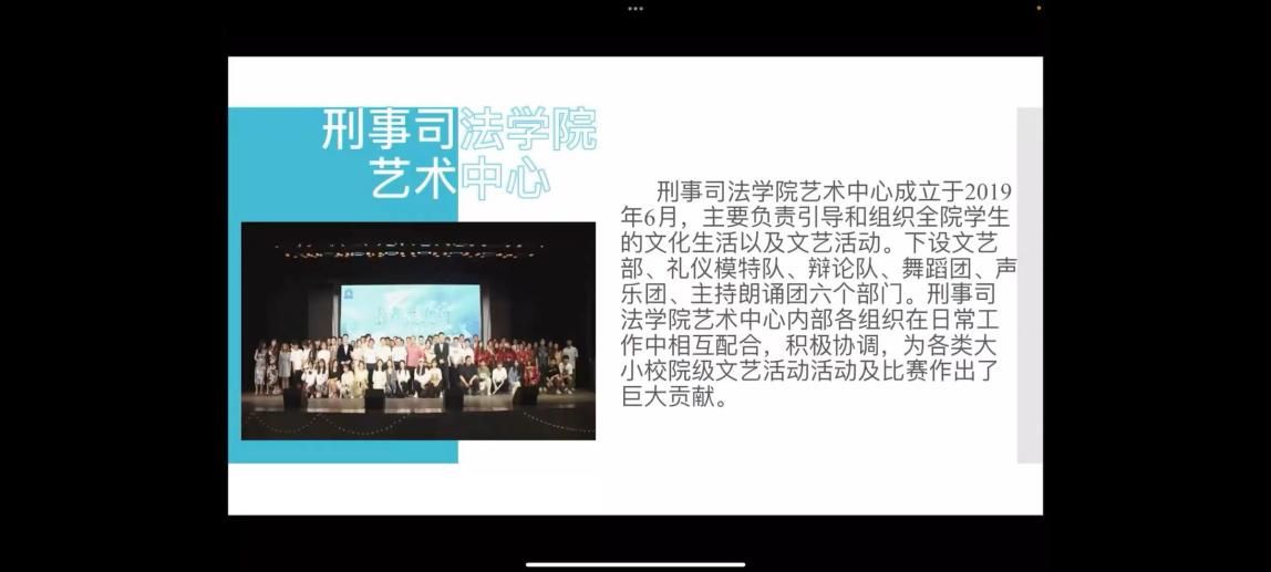 最后,院艺术中心按照文艺部、主持朗诵团、声乐团、舞蹈团、礼仪模特队、辩论队的顺序进行宣讲。我院艺术中心在我院党委团委的领导下,带领我院青年学生开展各类文体活动,丰富了青年学生们的大学生活,也展现了刑司学子对于艺术的追求和对于梦想的热爱。